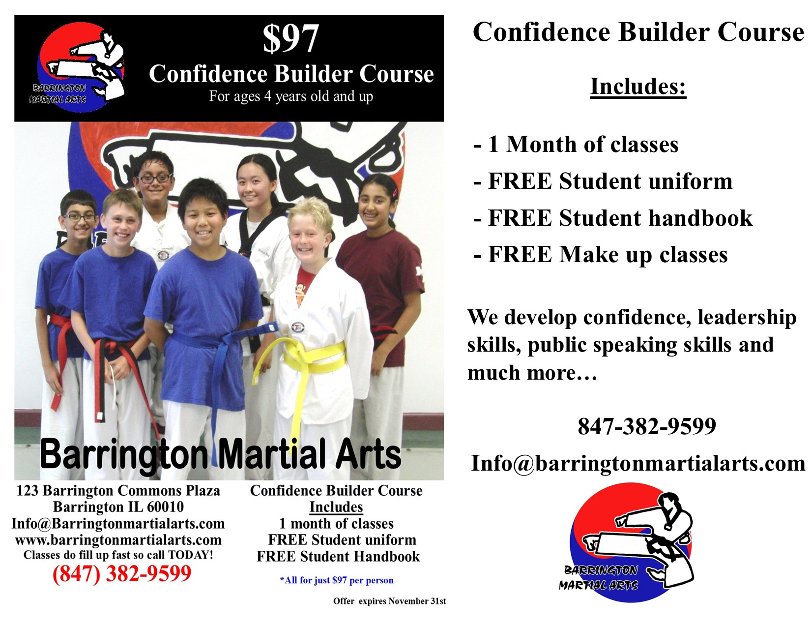 Great kids/adult Tae Kwon Do programs. Really teaches all the essentials: self confidence, self defense, focus, endurance.